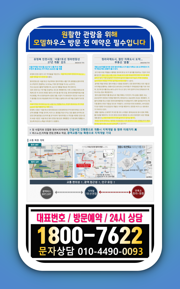 앞으로 교통 도로망부터 다양한 시설들이 개발 예정되어 있습니다. 먼저 교통 확충 계획을 살펴보겠습니다. 영종도에서 여의도를 30분 이내에 갈 수 있는 제3연륙교가 25년에 개통될 것이며, 지하철 7호선이 청라까지 연장되어 27년에 개통할 예정입니다. 또한 광역버스 BRT와 GRT 노선 개발로 교통이 더욱 편리해질 것입니다. 이에 따라 인근 도시로부터 인구가 유입될 전망입니다.