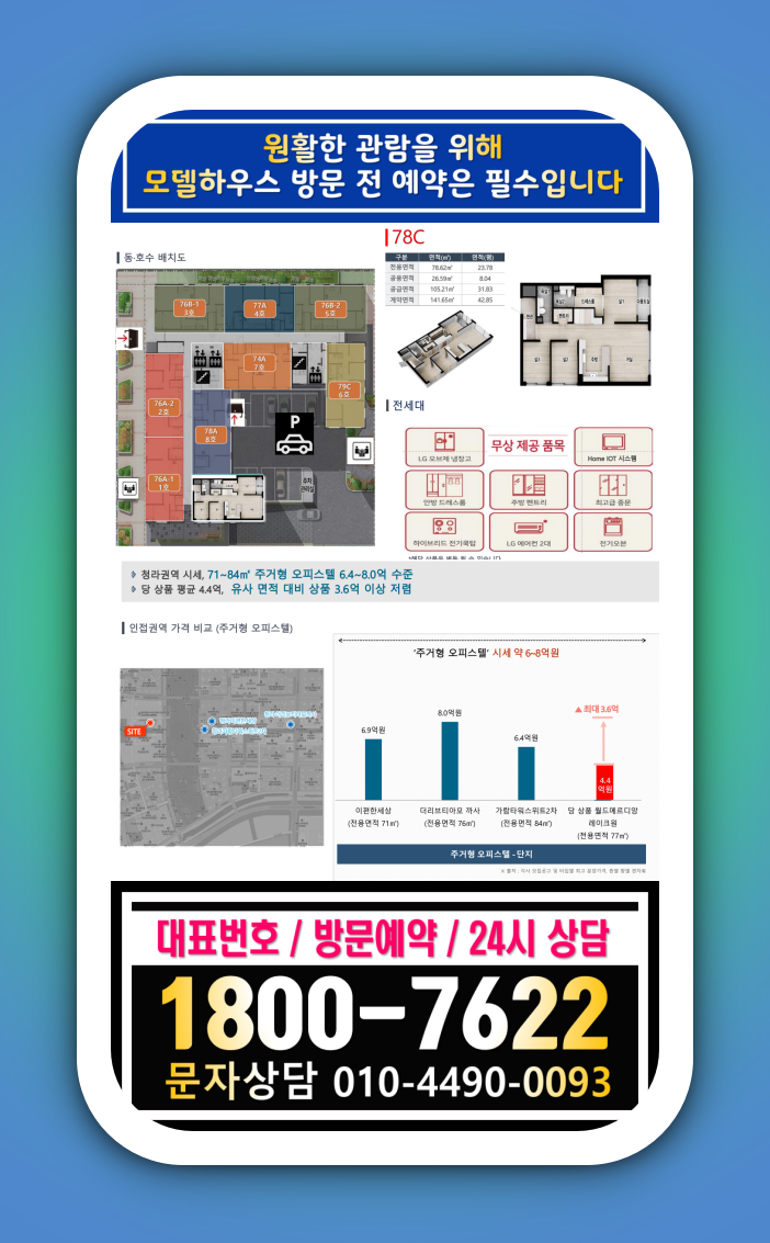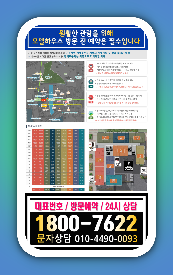 인천광역시 서구 청라동에 위치하는 당 사업지는 청라시티타워역이 들어서는 초역세권 자리와 인접합니다. 입지가 좋은 오피스텔은 지하 4층에서 지상 19층으로 구성되며, 근린시설이 10호, 오피스텔이 162실 공급됩니다. 평형대는 74㎡~79㎡까지로 주거 공간이 넉넉할 것으로 보입니다.